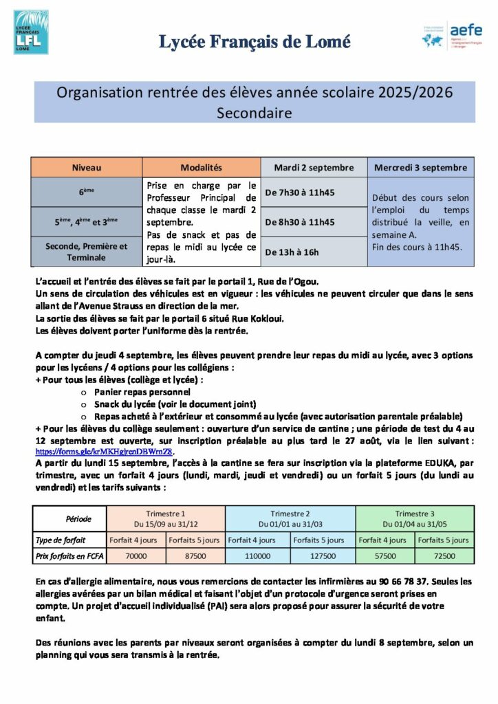 Organisation de la rentrée des élèves – 2 septembre 2025 – Collège et Lycée