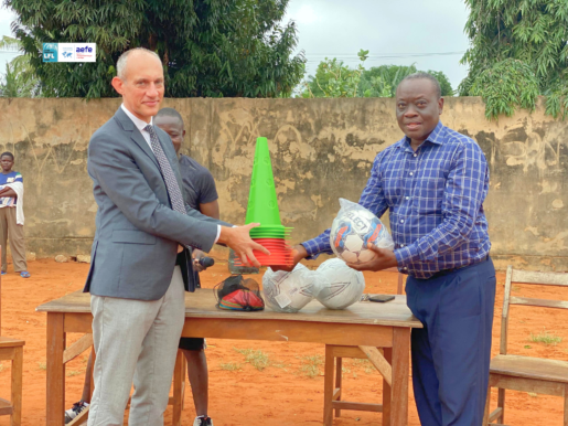 En marge de la signature, quatre matchs amicaux ont opposé les moins de 16 ans des deux lycées. L’ASLFL, représentée par Christophe Laborde, Proviseur du LFL et Président de l’ASLFL, et Bassoma Bawila, Coordonnateur EPS, a profité de l’occasion pour remettre au Lycée Tokoin Solidarité un lot de matériel sportif (ballons, plots et cage).